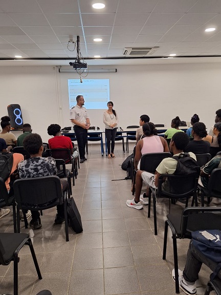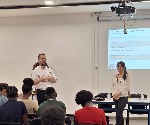 De 7h30 à 8h30, nous avons d’abord rencontré le directeur de la Police aux frontières. Il nous a présenté son métier et les missions de la PAF en Guyane à l’aide d’un diaporama. Ensuite, nous lui avons posé plusieurs questions, notamment sur son travail à l’aéroport et ailleurs sur le territoire et sur la façon de devenir policier. Il a répondu à toutes nos questions. L’échange était pertinent et passionnant, et le temps est passé très vite. La salle était pleine avec plusieurs enseignants présents.