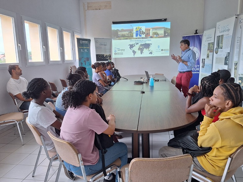 M. PEYREFITTE a également détaillé les différents laboratoires présents au sein de l’Institut Pasteur de Guyane et leurs collaborations avec de nombreux partenaires scientifiques. Pour conclure, il a évoqué l’orientation des élèves en présentant les divers parcours permettant d’intégrer l’Institut Pasteur, ainsi que la variété des métiers qui y sont représentés : techniciens, ingénieurs, chercheurs, etc.